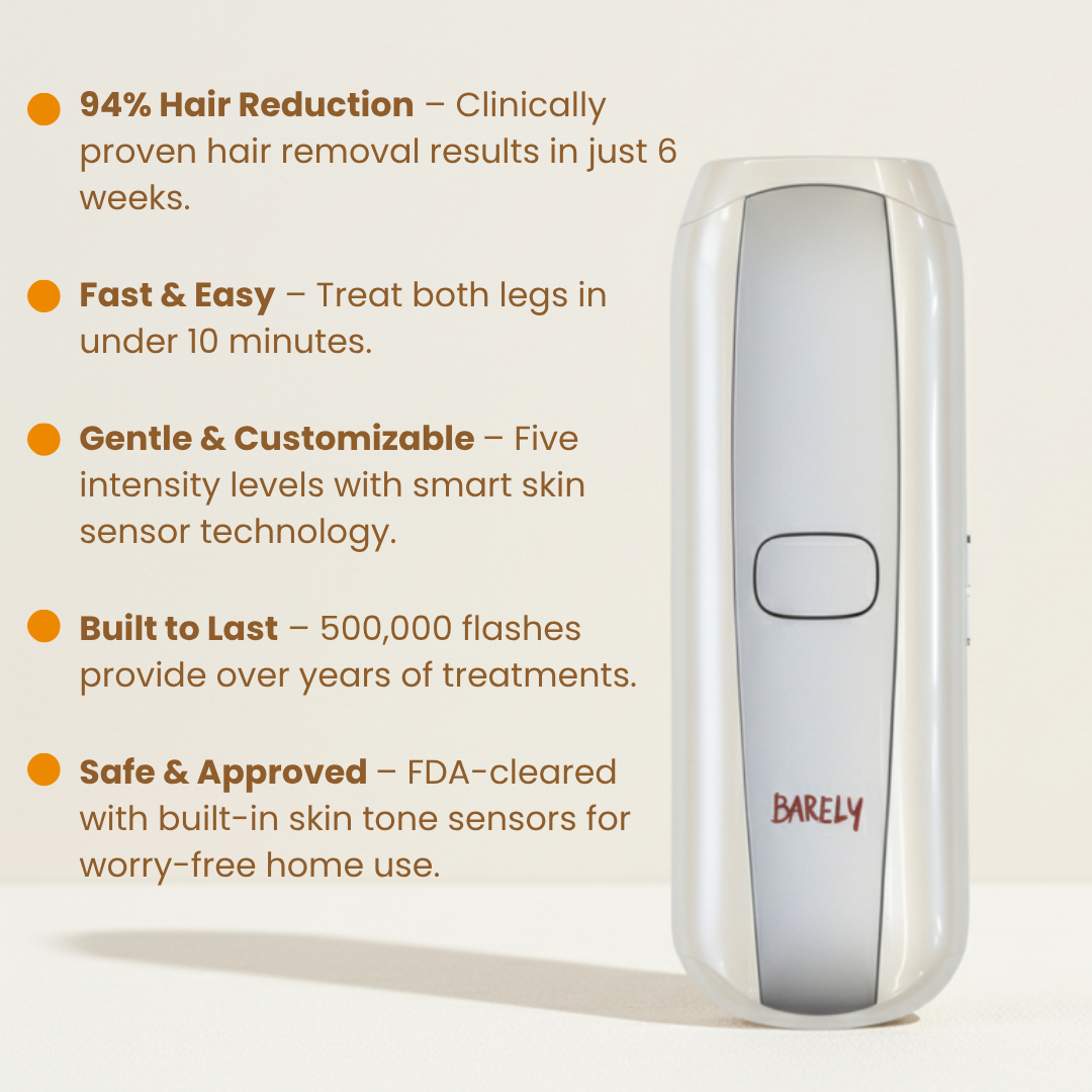 Say goodbye to razors, waxing appointments, and unwanted hair. The Barely Crystal Skin uses advanced IPL (Intense Pulsed Light) technology to target hair at the root, delivering salon-quality results from the comfort of your home.